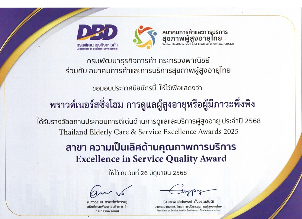 พราวด์เนอร์สซิ่งโฮม ได้รับรางวัล สถานประกอบการดีเด่นด้านการดูแลผู้สูงอายุ ประจำปี 2568 ในประเภท “ความเป็นเลิศด้านคุณภาพการบริการ